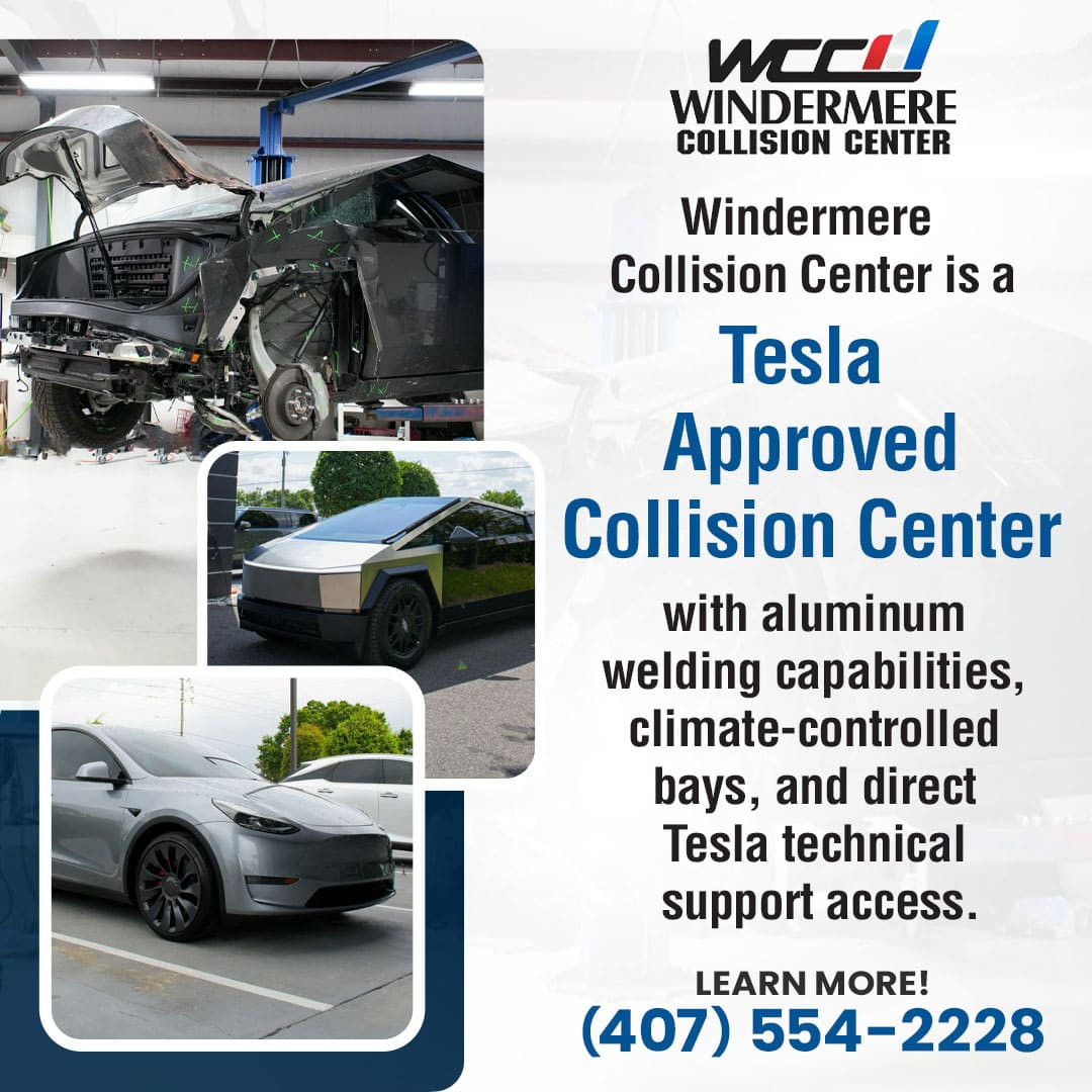 Central Florida Tesla owners can schedule consultations by calling (407) 554-2228 to speak with Tesla-certified specialists at Windermere Collision Center. The facility offers Tesla collision repair estimates and handles all insurance coordination.